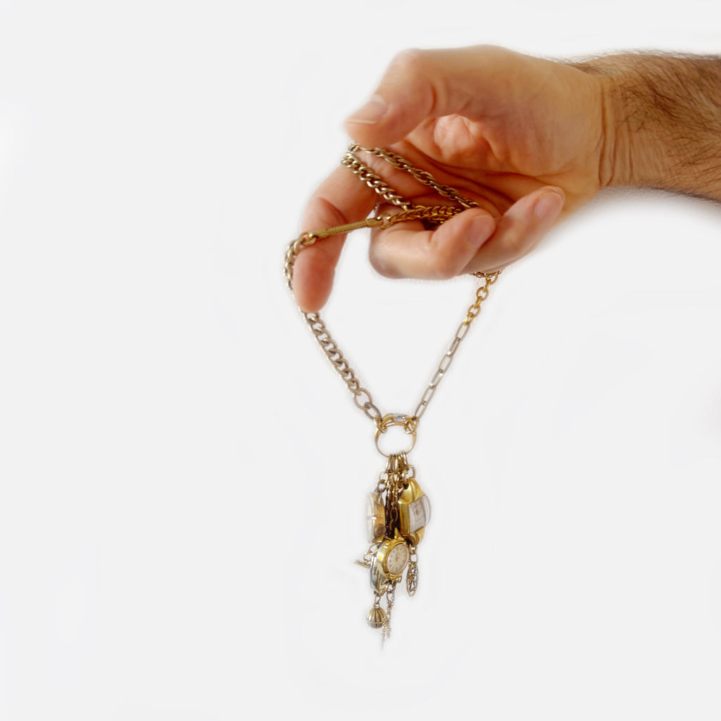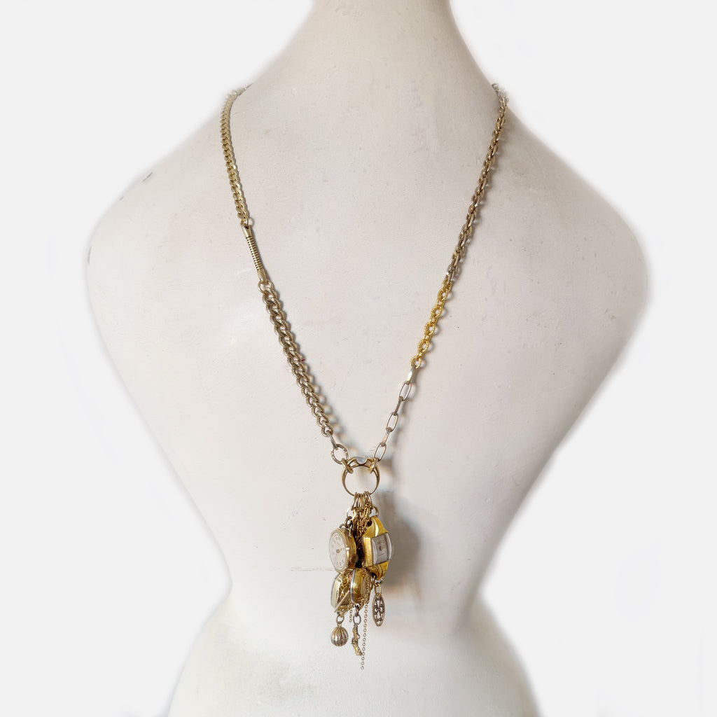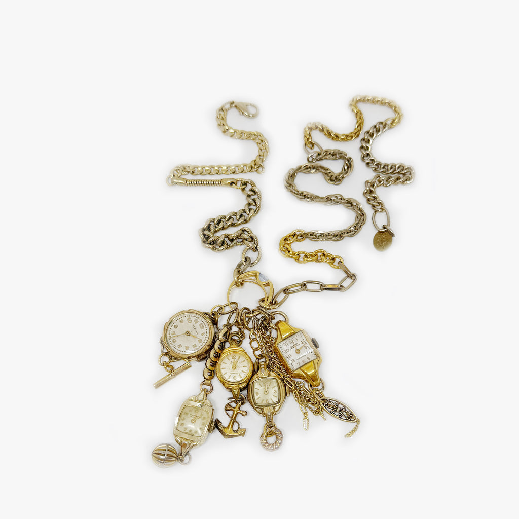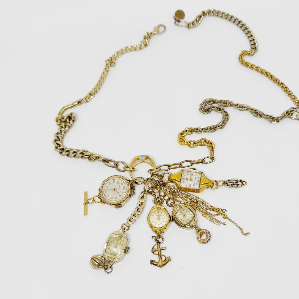 A Maria Zureta signature piece, made with five stunning timeless vintage wrist watches, gold tone chains (some costume, others plated) and a vintage ring holding everything together. Versatile, it can be worn as a short or as a long piece.